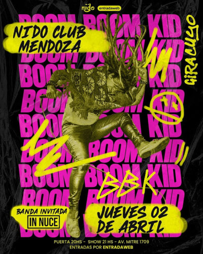 Boom Boom Kid regresa a Mendoza para desplegar su universo sonoro en una noche donde el punk, el hardcore y el rock se cruzarán sin reglas ni concesiones. El show tendrá lugar el jueves 2 de abril a las 20 hs en Nido Club (Mitre 1709, Ciudad), con entradas disponibles a través de Entradaweb.com.ar.